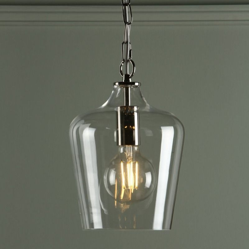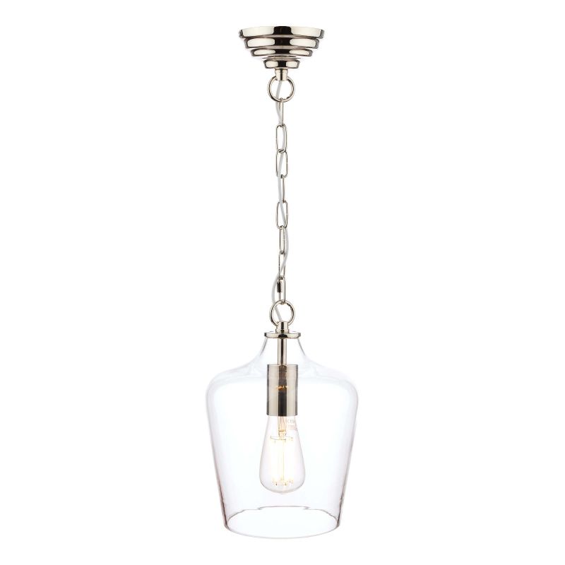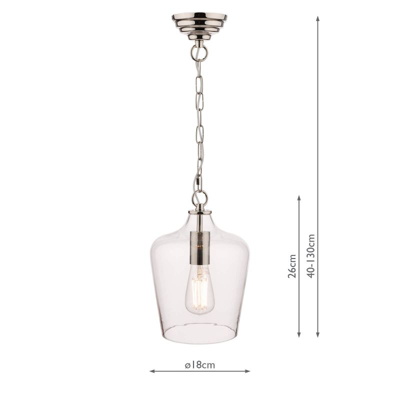 Ockley, pendellampe i glass og krom, en moderne variant av retrofasong. Den flaskeformede glasskjermen og kromfargede metallet gir den et stilrent og moderne utseende.