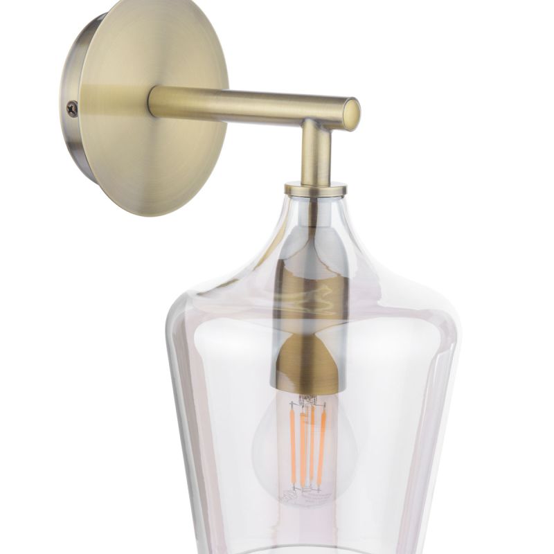 Ockley, vegglampe i champagnefarget glass og messing, en moderne variant av retrofasong. Den flaskeformede glasskjermen og det messingfargede metallet gir den et stilrent og moderne utseende.