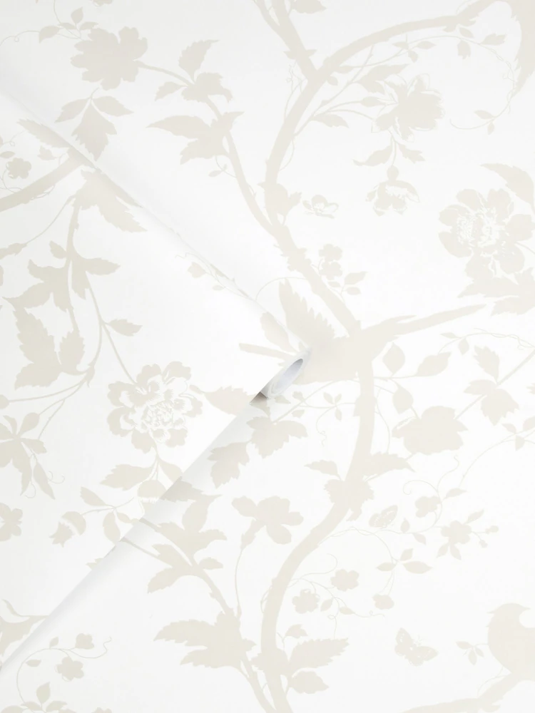 Oriental Garden, tapet med fugler i hvitt og perlemor fra Laura Ashley