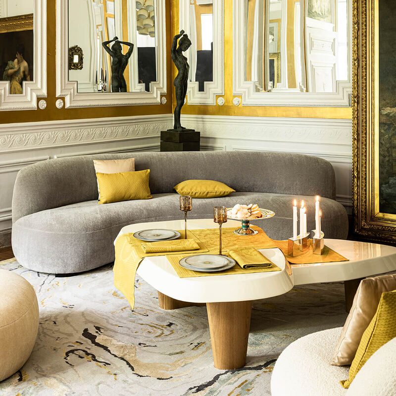 Palais Vènitien, design fra Le Jacquard Francais inspirert av marmorgulvene i Venezia`s sine palasser. Med barokk inspirasjon og geometriske mønster som fremhever italiensk eleganse. Dette er en elegant løper i gul bomull som vil være som et smykke på bordet.