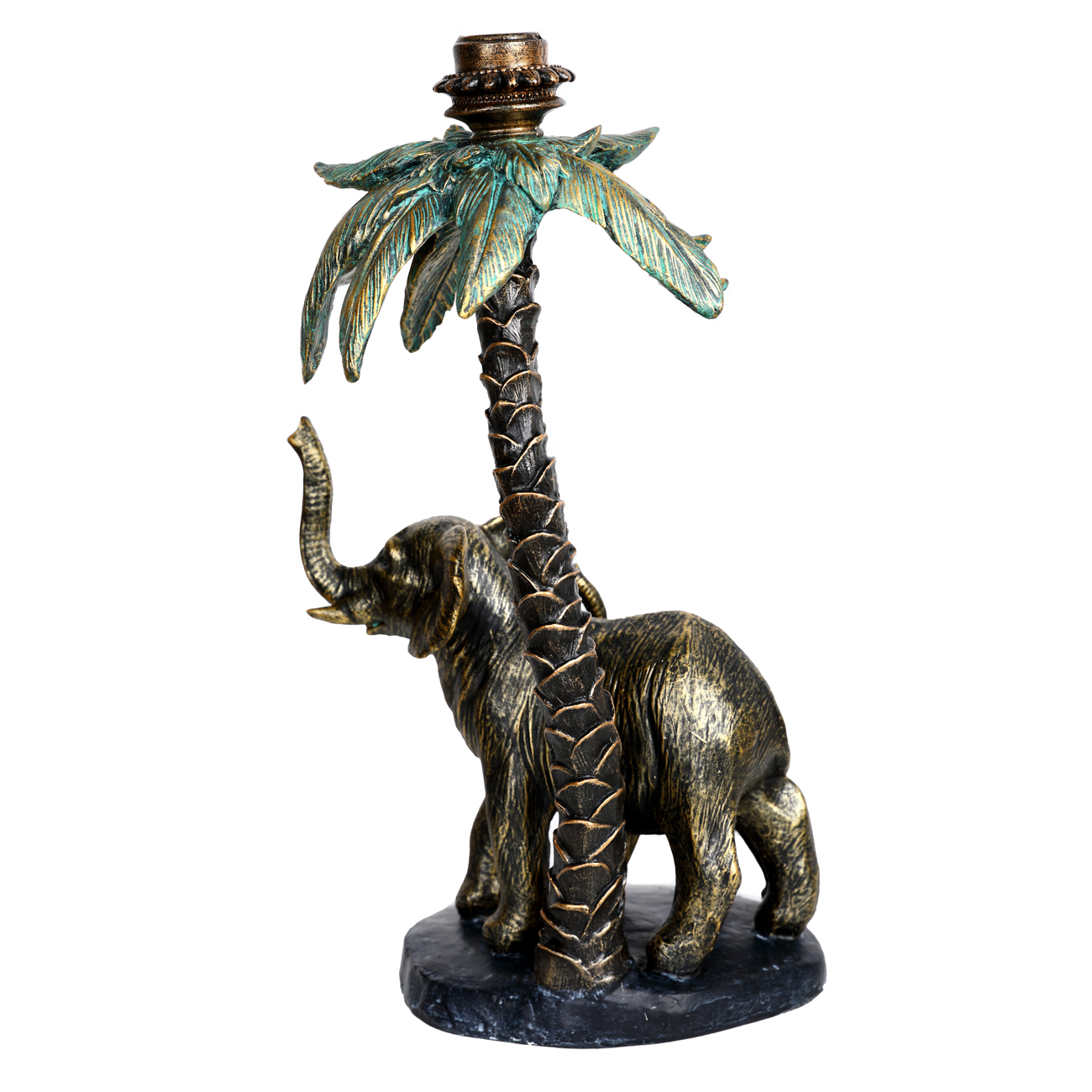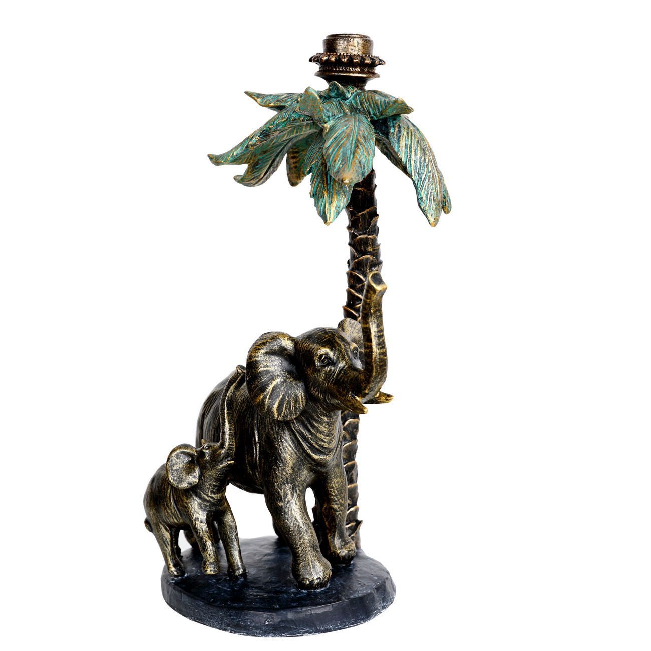 En vakker skulpturell lysestake i støpt kunstmateriale, med palmetre og elefanter. Støpningen skaper en stemning og gir eleganse både med og uten lys. En eksotisk lysestake som vil være perfekt til dyreelskeren.