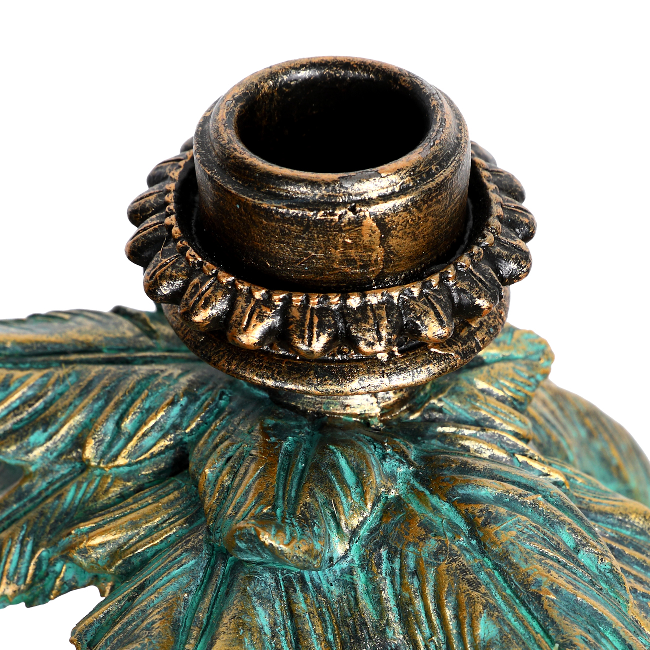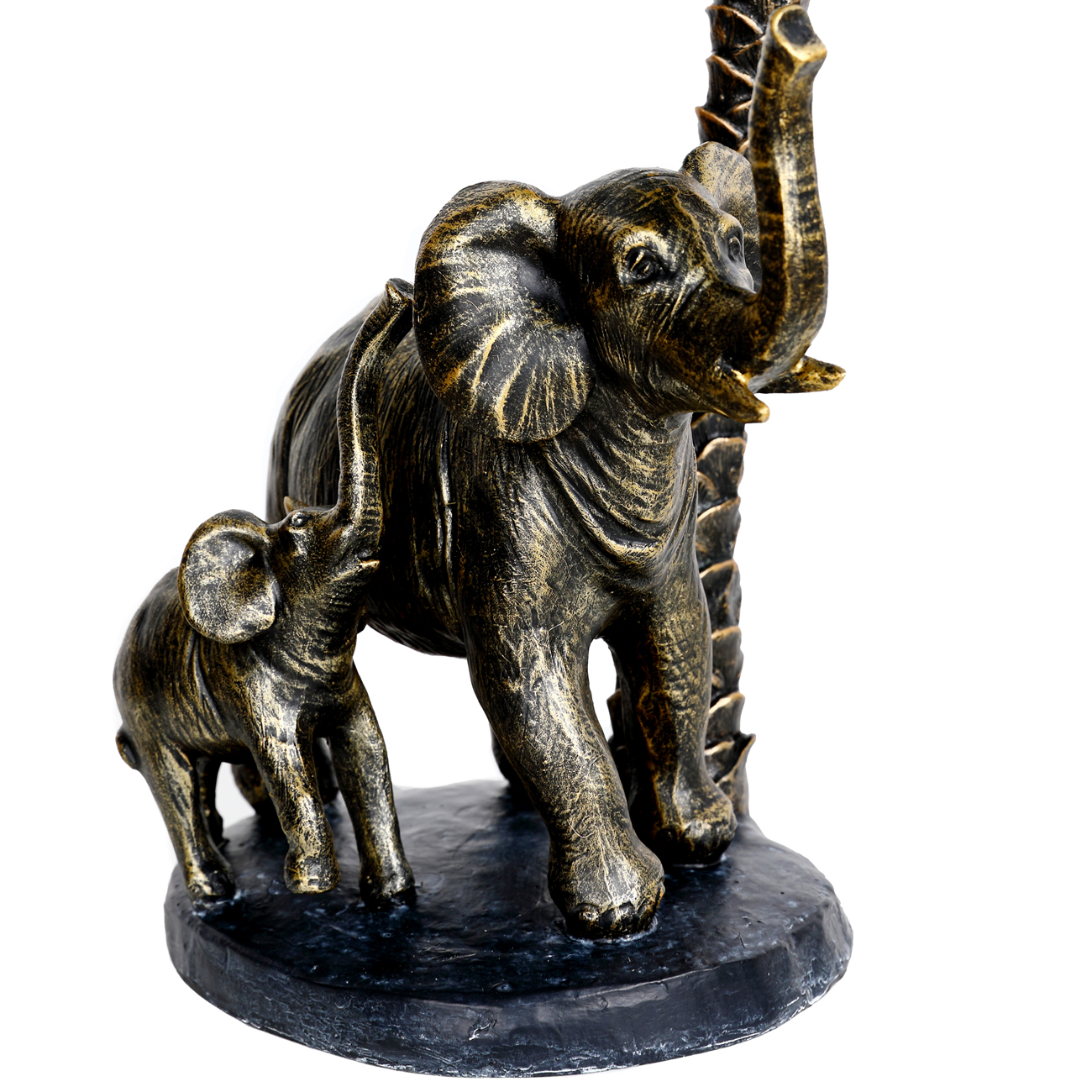 Blending playful character with crafted form, this decorative candle holder captures a moment of movement and care. A mother elephant and her calf walk in sync beneath the sculpted canopy of a palm tree, their forms rendered in antique gold with a softly distressed surface. Cast in a blend of polyresin and limestone, the piece is detailed with layered texture and a grounding black base.