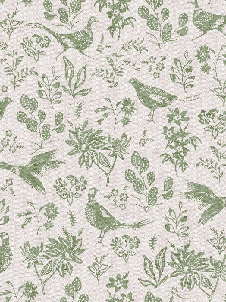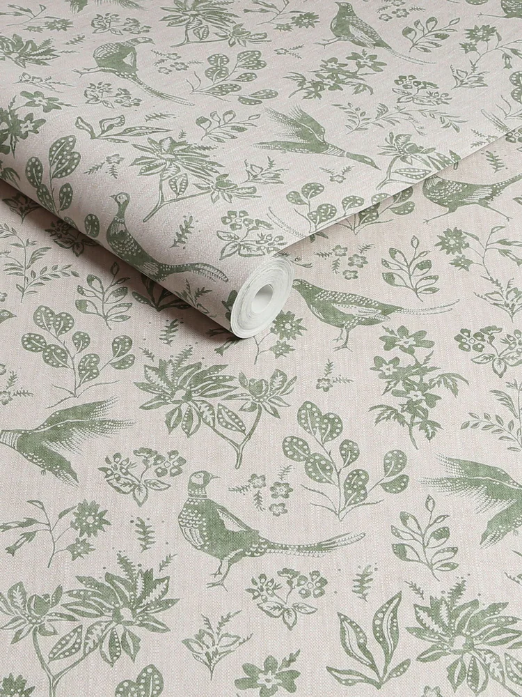Pheasant, landlig og sjarmerende tapet med fasaner i grønt, håndtegnet av Joules sitt designteam. En tapet som bringer britisk sjarme og landstil til rommet.