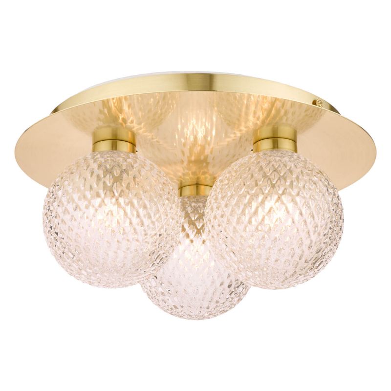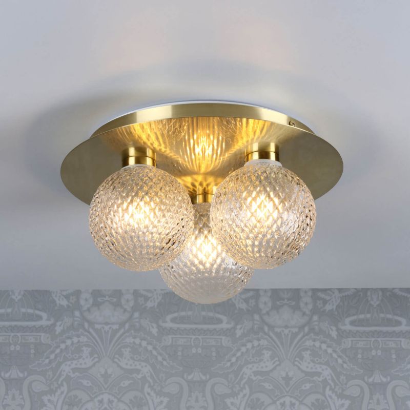 Prague, elegant og moderne taklampe til baderommet i klart kuleformet glass og gull fra Laura Ashley. De tre glasskuplene med lekker tekstur, gir Prague tidløse kvaliteter. En lekker lbaderomslampe som vil gi moderne glamour og eleganse til rommet.