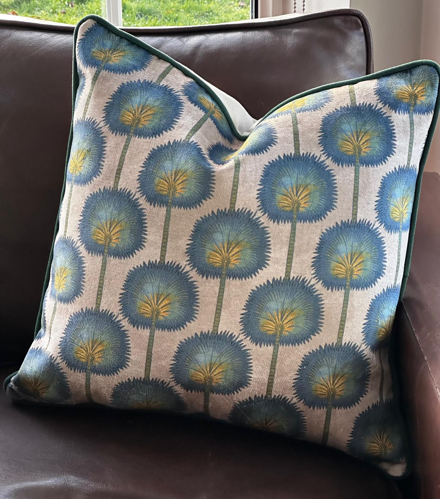 Rajasthan Co Aqua fra Art of the Loom sin Archives kolleksjon, et vakkert fløyelsstoff med stiliserte palmeblader. Her i en spennede fargekombinasjon med blått og blågrønne toner. Stoffet har ull bakside, og er flammehemmende, med en martindale på 78 000 er det velegnet til møbler.
