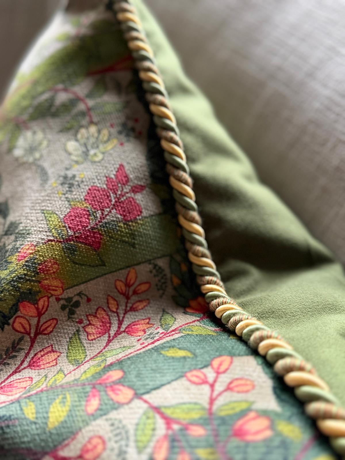 Putetrekk i fløyel med et stiliserte trær i grønt og vårlige toner. En elegant kanting med tvunnet tau i gult og grønt, og en grønn bakside gir puten et eksklusivt og luksuriøst uttrykk.