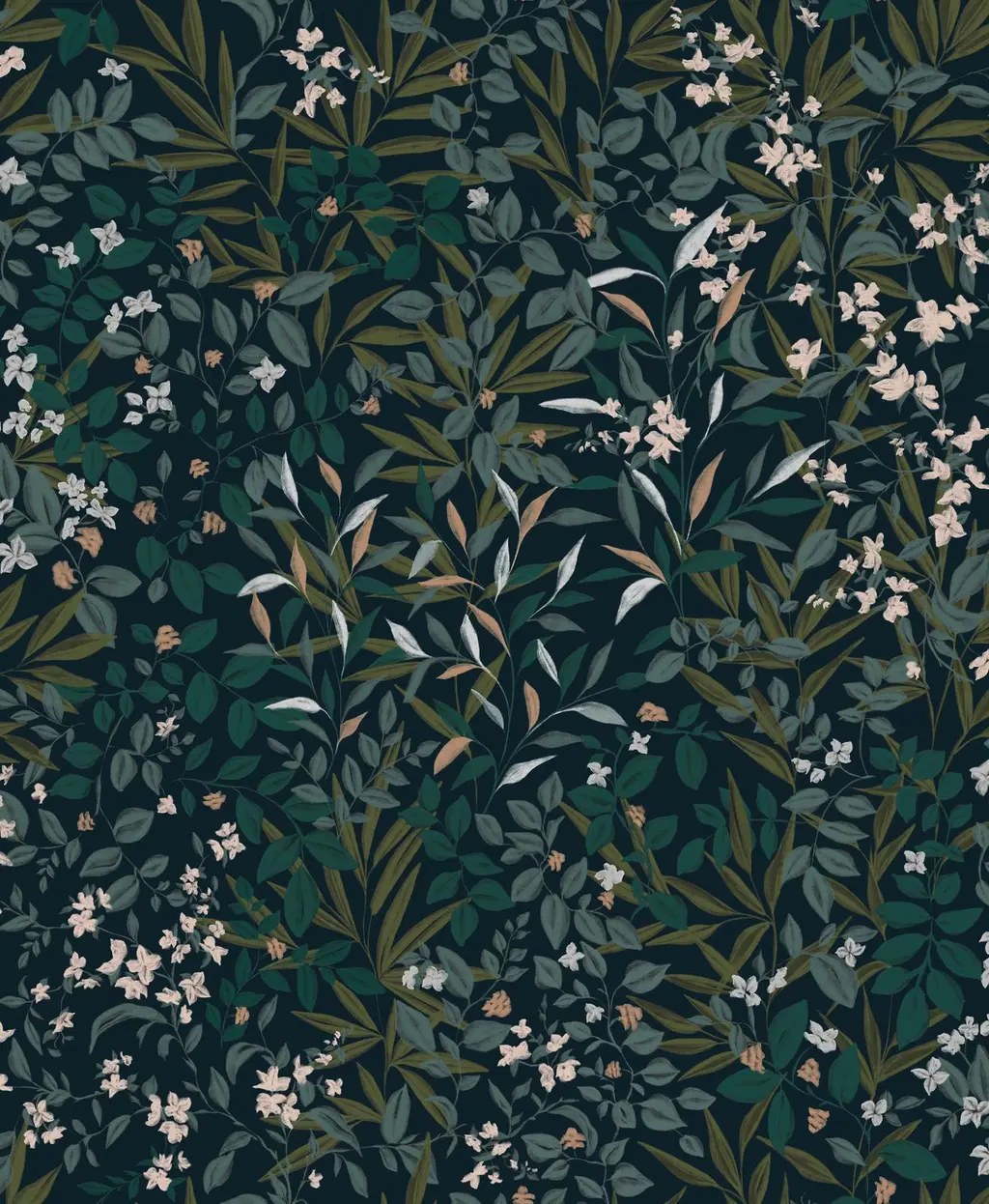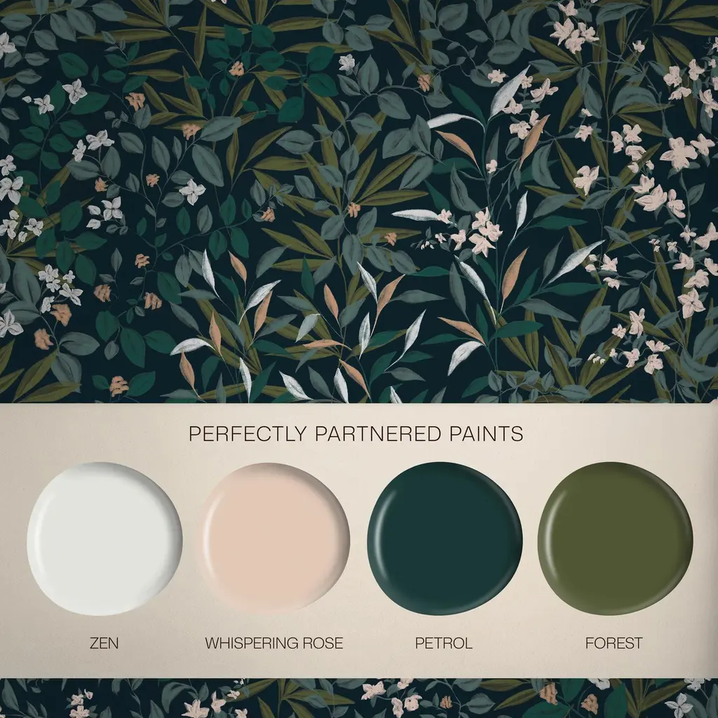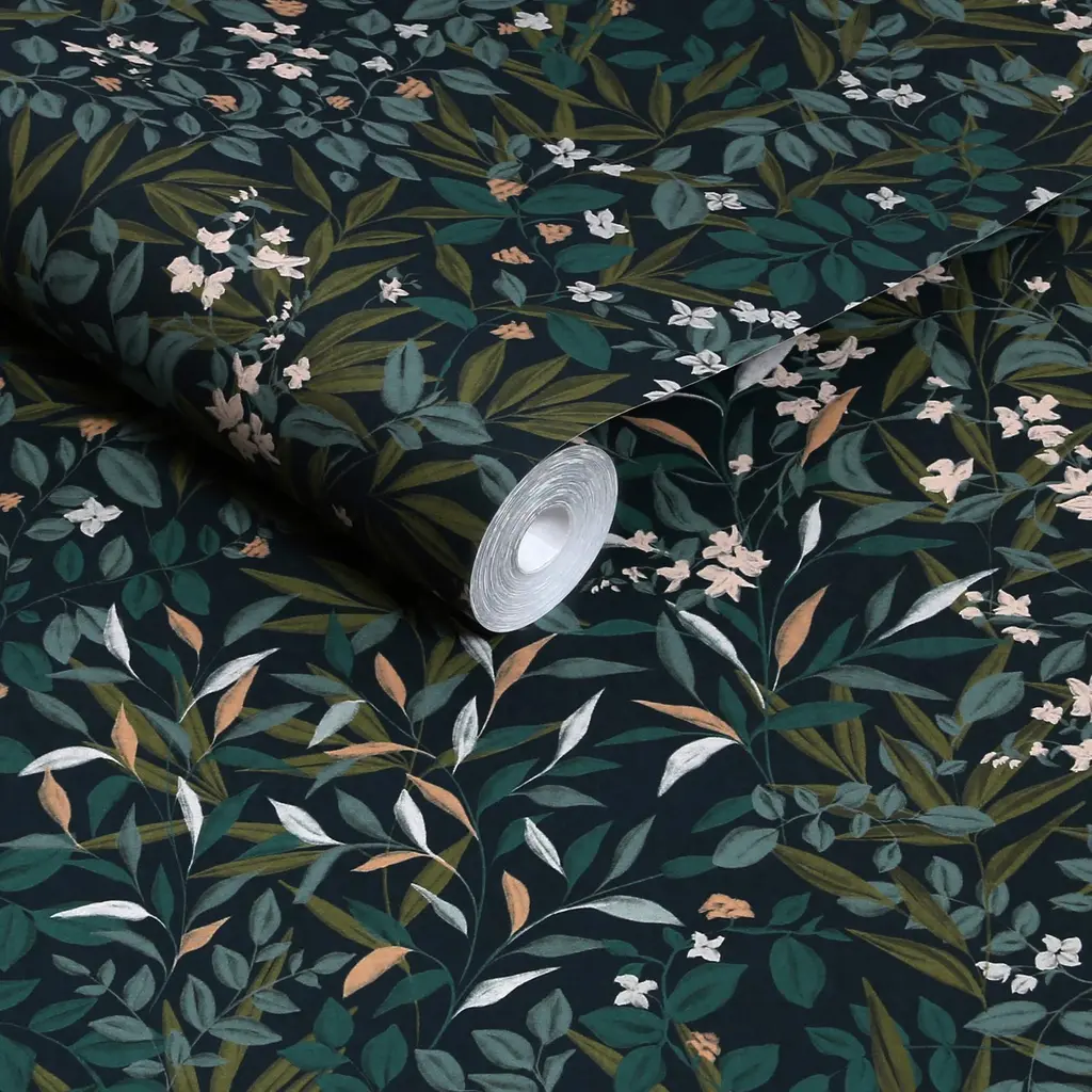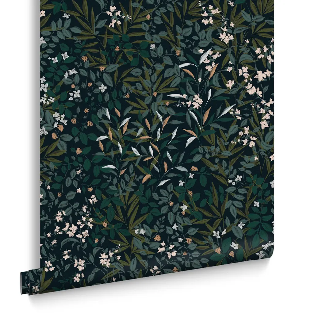 Tapeten Reverie Navy er et heldekkende bladdesign som fremkaller rikdommen i en hage etter skumring. Lag med malt bladverk sveiper over veggen i nyanser av dypgrønt, rosa og elfenbensfargede blomster sprer seg som stjerner mot den midnattsblå bunnen.