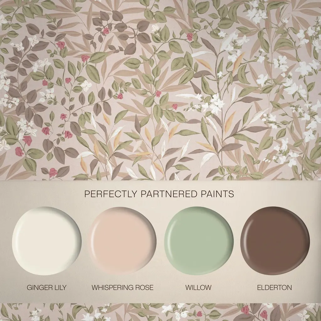 Med sine håndmalte detaljer forvandler tapeten Reverie Whispering Rose vegger til et lerret av naturlig skjønnhet. En varm bakgrunn setter scenen for lag med løvverk, der formene overlapper hverandre i en grasiøs rytme.