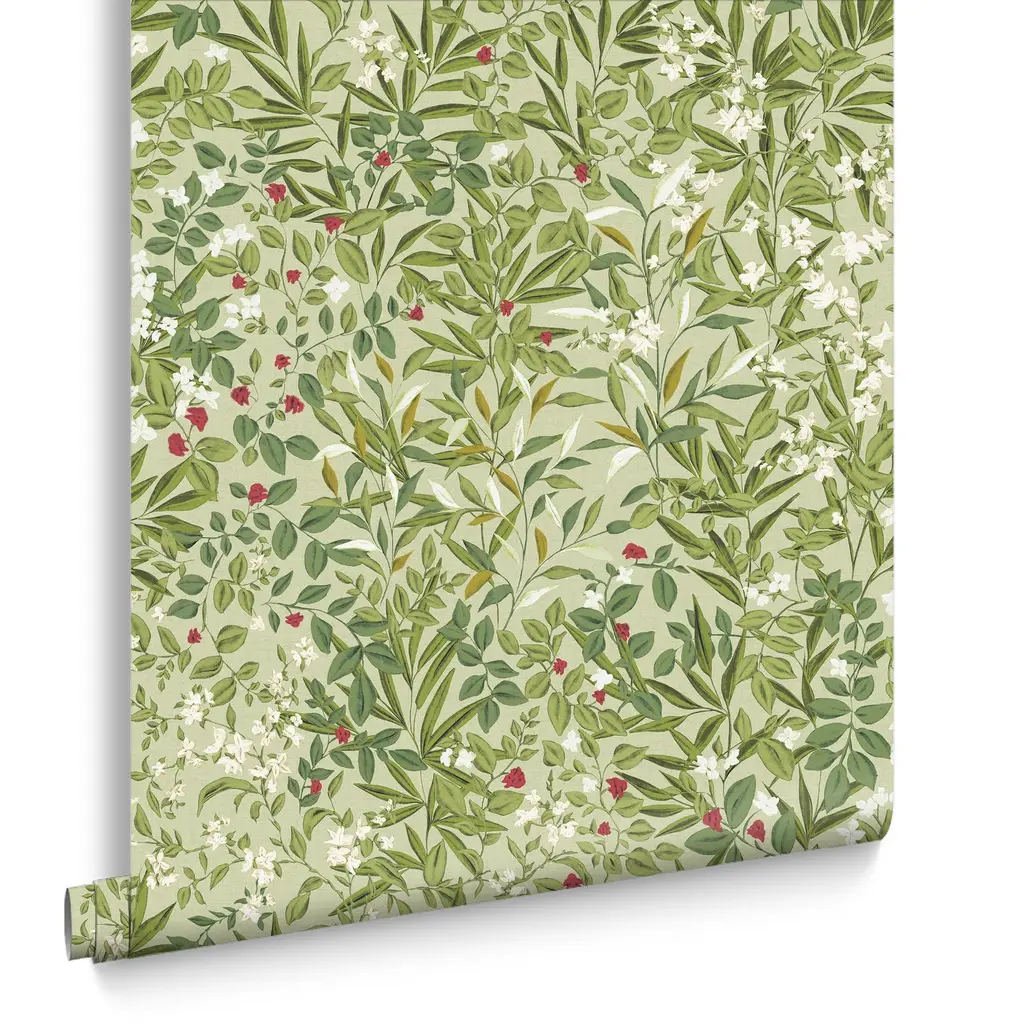 A gentle vision of foliage unfolds across Reverie Willow Wallpaper, where sweeping green leaves are touched with white blossoms and flashes of crimson. The design feels light and lyrical, evoking the calm of a garden in full bloom.