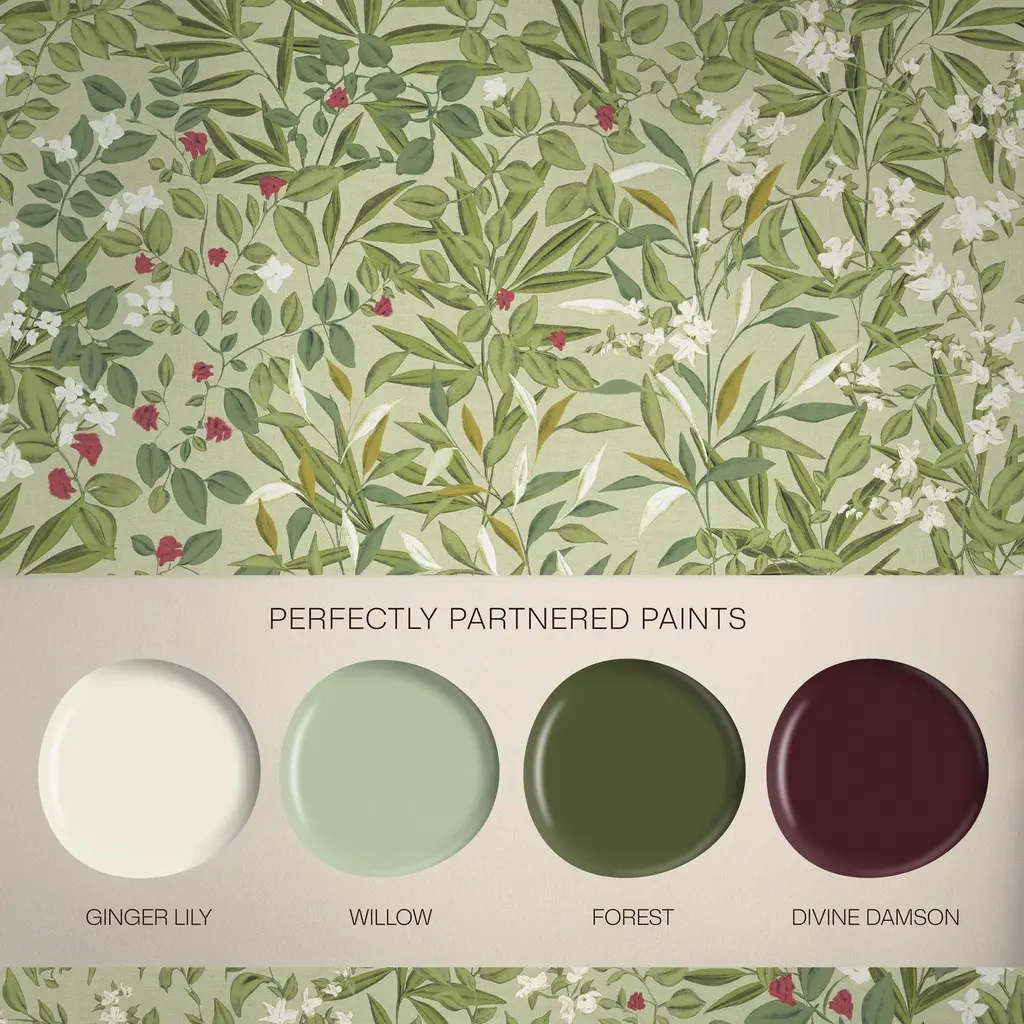Et mildt syn av løvverk utfolder seg over tapeten Reverie Willow, hvor sveipende grønne blader, delikate hvite blomster og glimt av karmosinrødt.