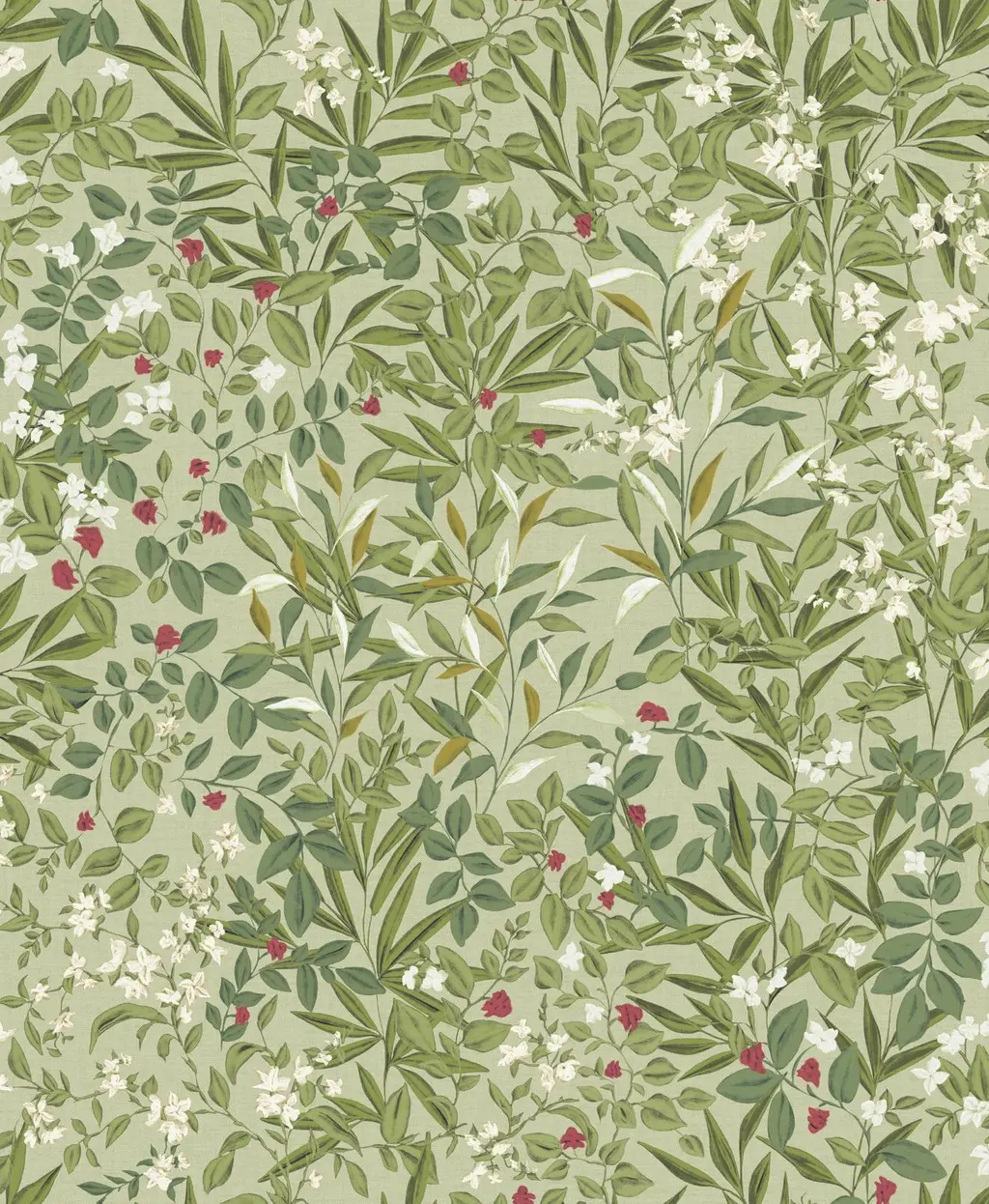 Designet føles lett og fremkaller roen i en hage i full blomst. En salviegrønn bakgrunn bringer mønsteret både friskhet og varme, og gir en følelse av naturens stille poesi til ethvert rom.