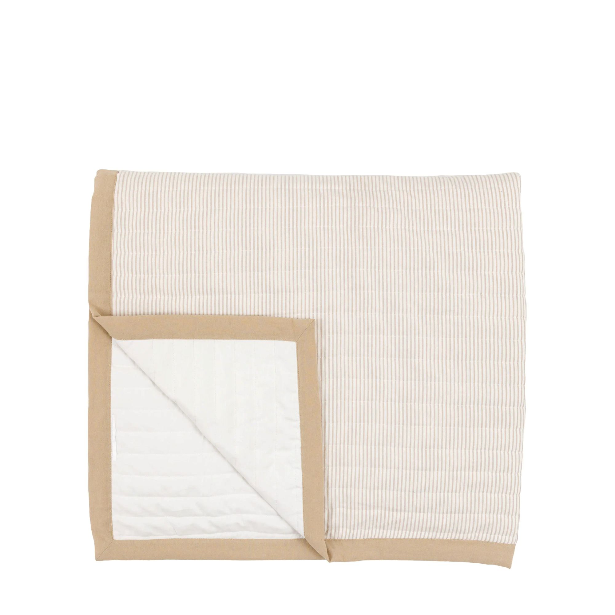 Dette sengeteppet er quiltet for komfort, og gir varme og en ekstra koselig følelse. Stilrent vevd stripedesign i beige/krem med en taupekant og ensfarget bakside. Designet for å passe komfortabelt i en dobbeltseng.