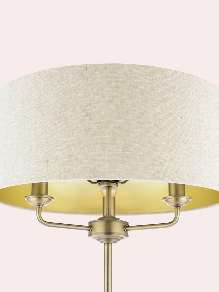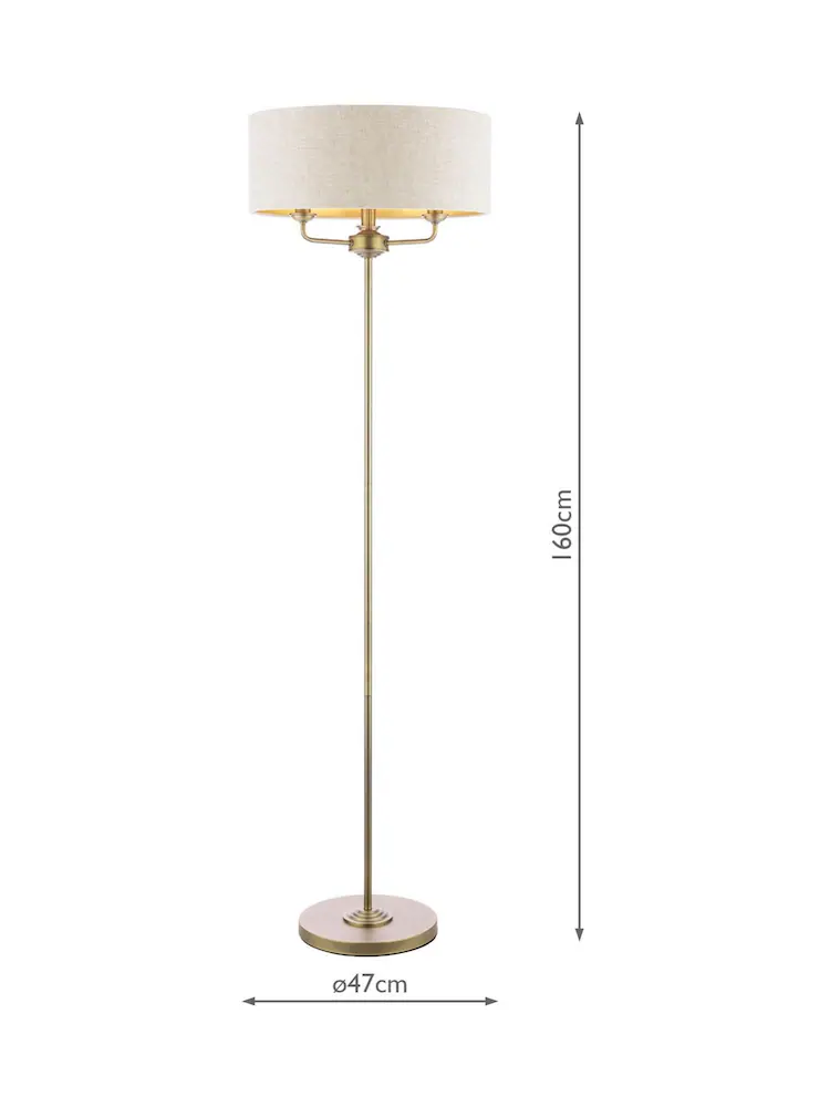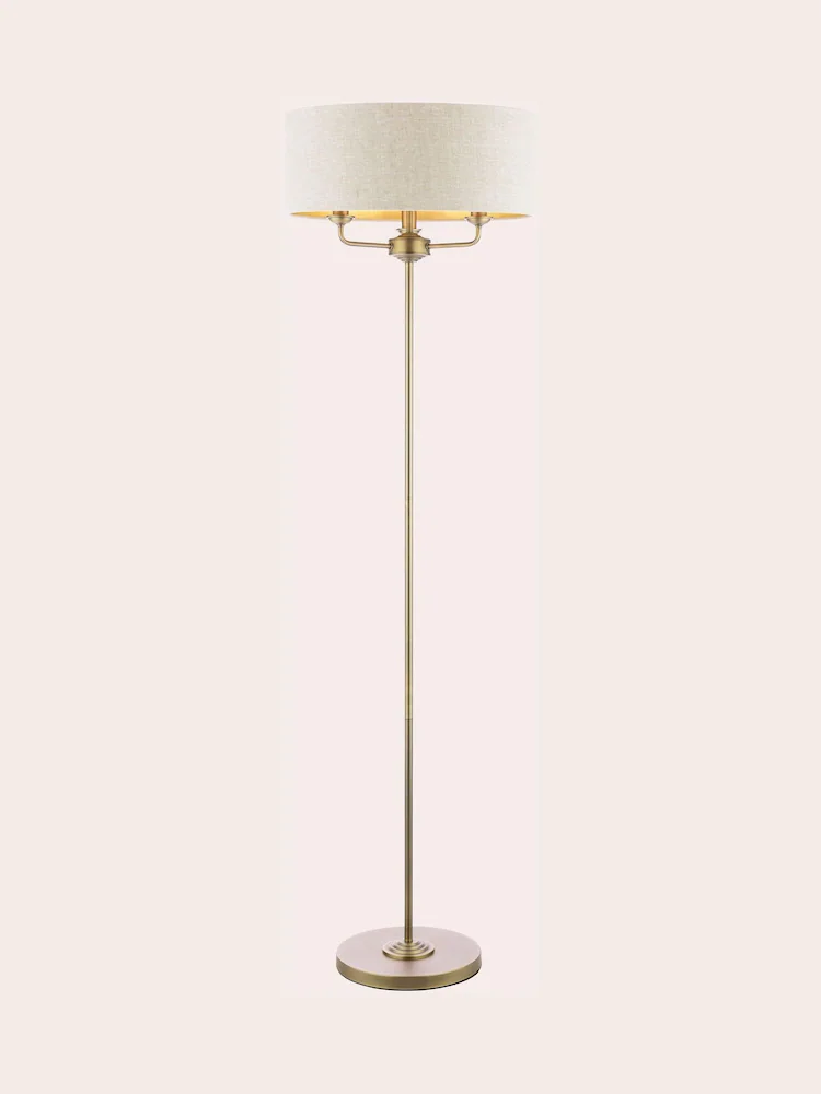 This triple light floor lamp comes in a traditional warm antique brass finish, and comes complete with a Natural Linen Drum shade.