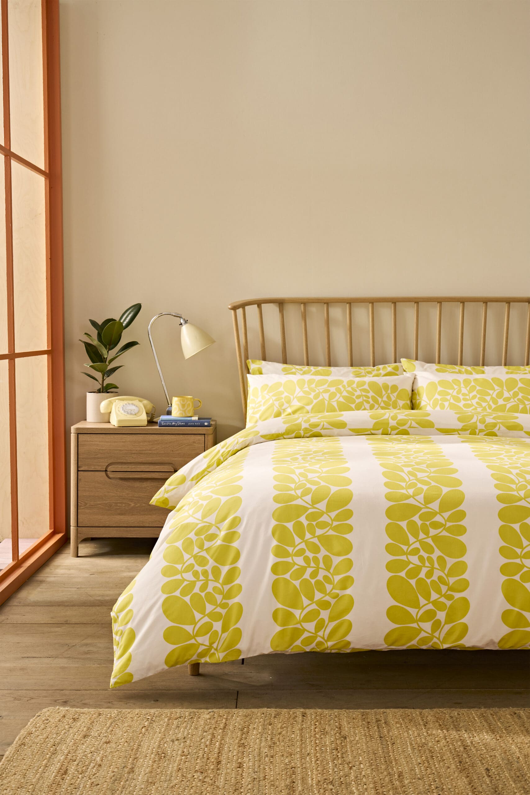 Et lekkert retro sengesett, Sycamore Stripe i klar gult og krem fra Orla Kiely. Stilrent grafisk retro design med klatrende blader i gult på kremfarget bunn. Et stilrent sett, som vil være en design statement på soverommet.