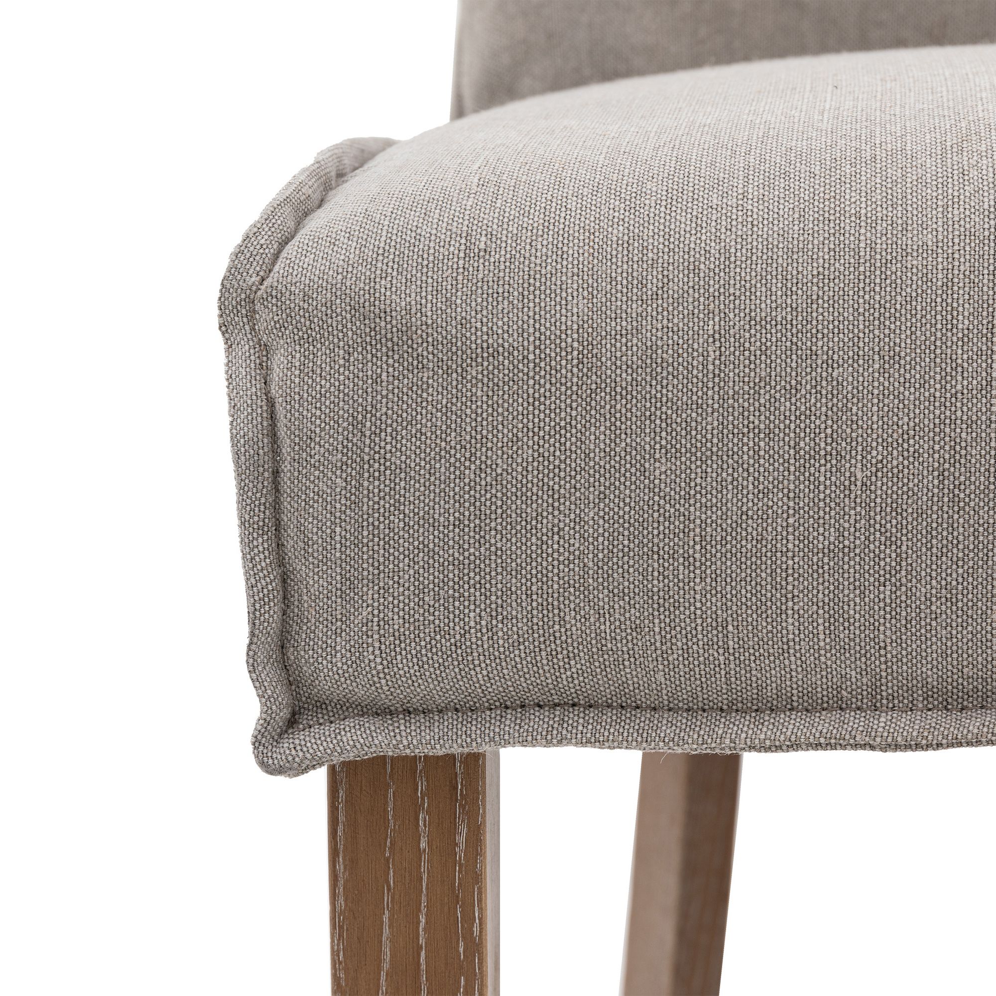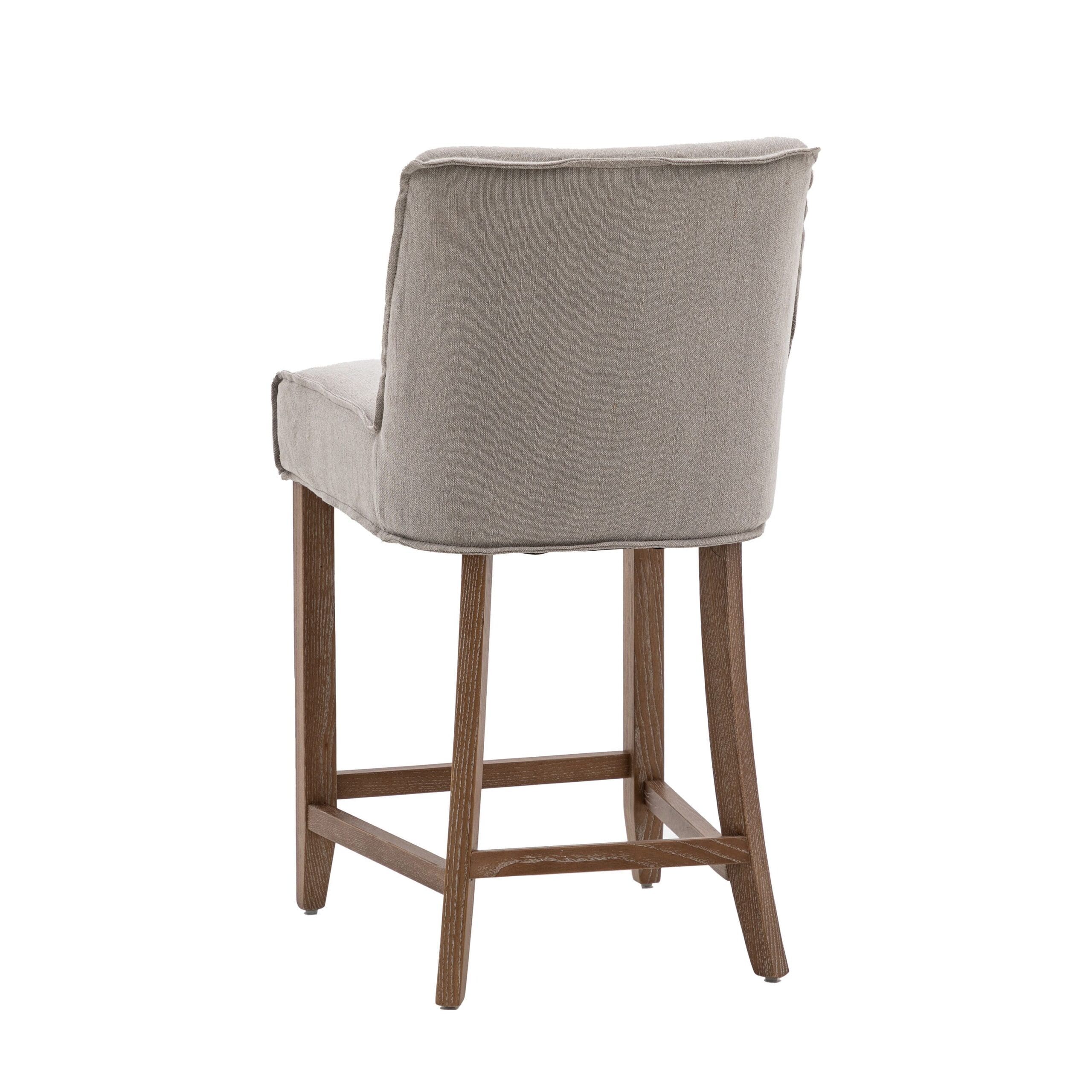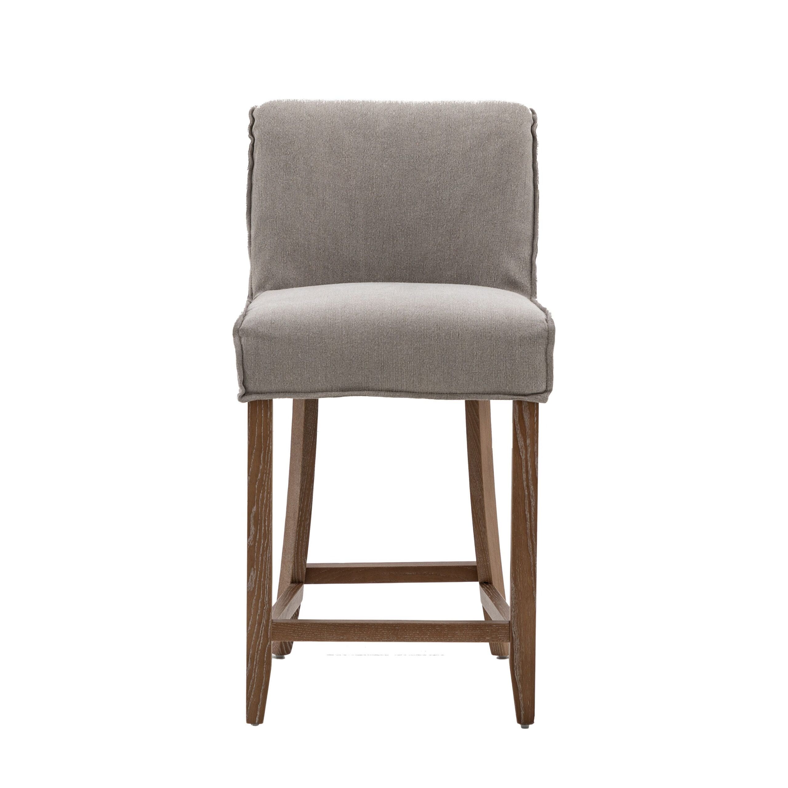 Soft and chic set of 2 bar stools designed to suit a range of interiors with ease. They would look equally at home in modern or vintage spaces. Upholstered in cement grey linen and finished with softly angled wood legs.