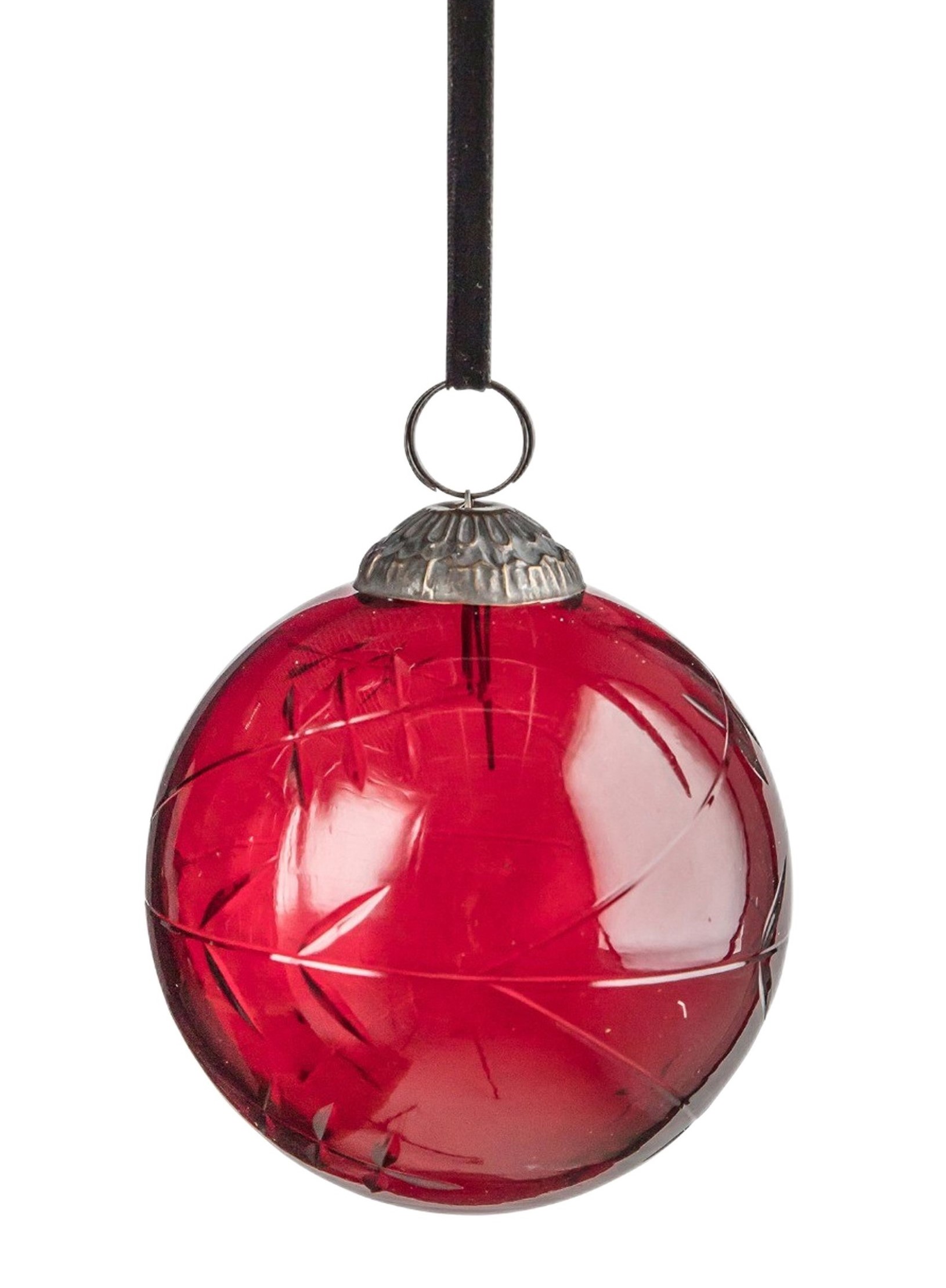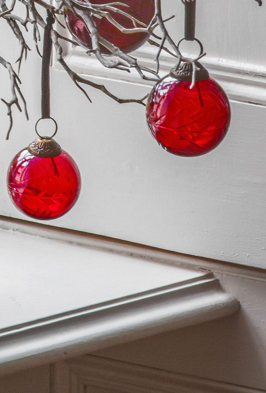 Tidløs julekule i slepet rødt glass. Klassisk og eksklusivt uttrykk, et vakkert innslag til julehjemmet.