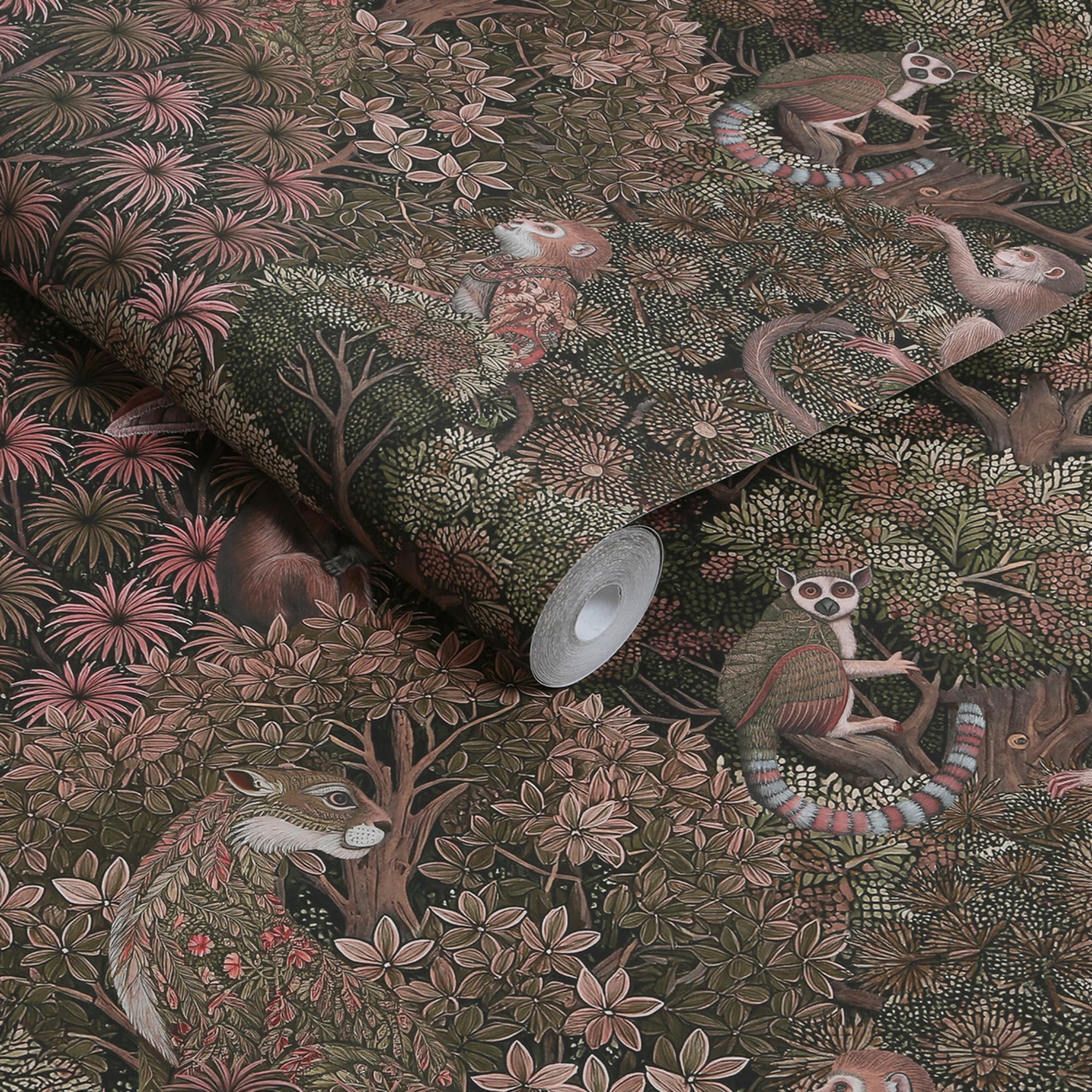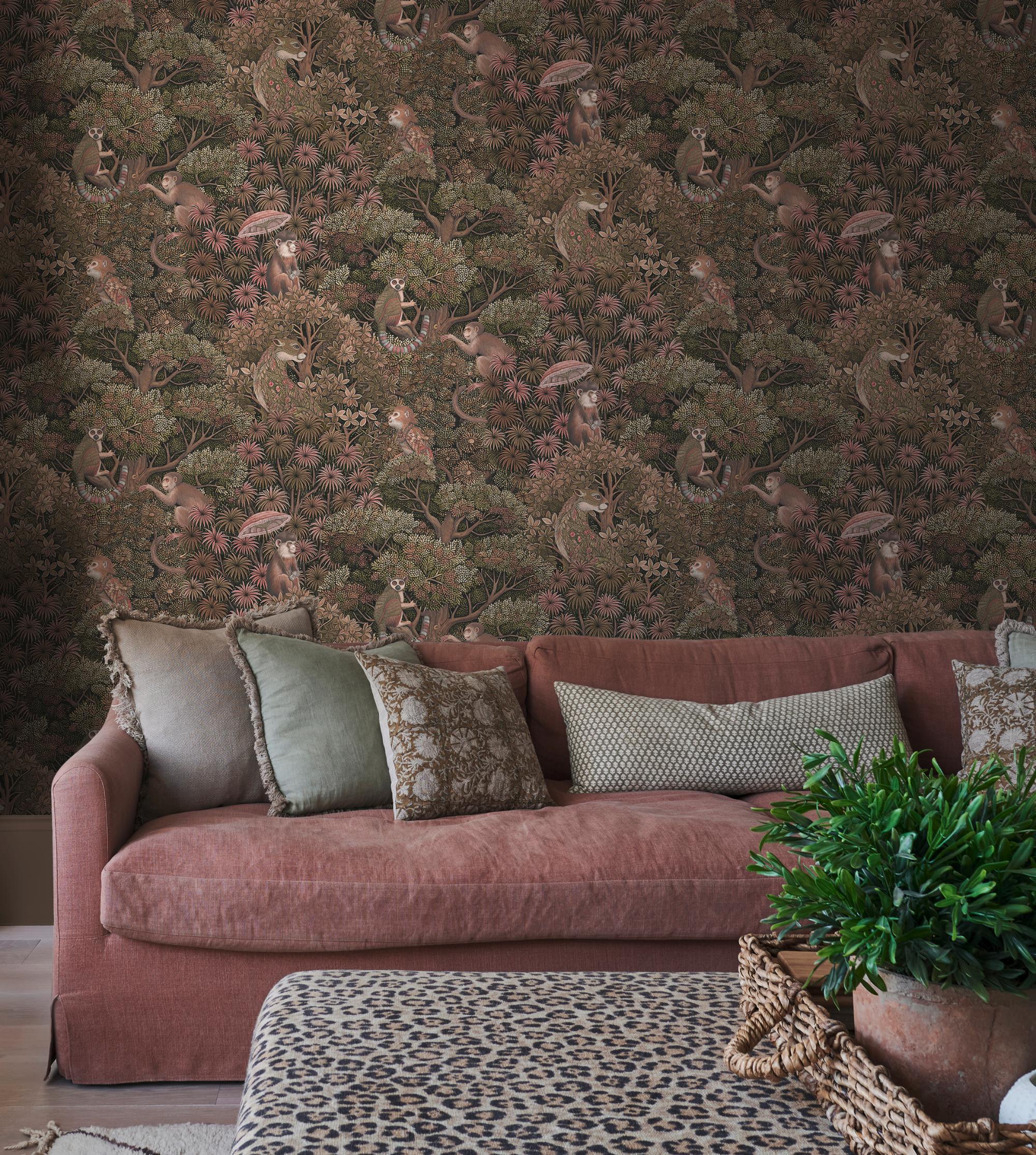 Treetop Troop, tapet med apekatter i støvet rosa. Jungelens dyr, apekatter, lemurer og leoparder, skaper en eksotisk spennende atmosfære. Det er som om man nesten avbryter dem i en hemmelig samtale på veggen.