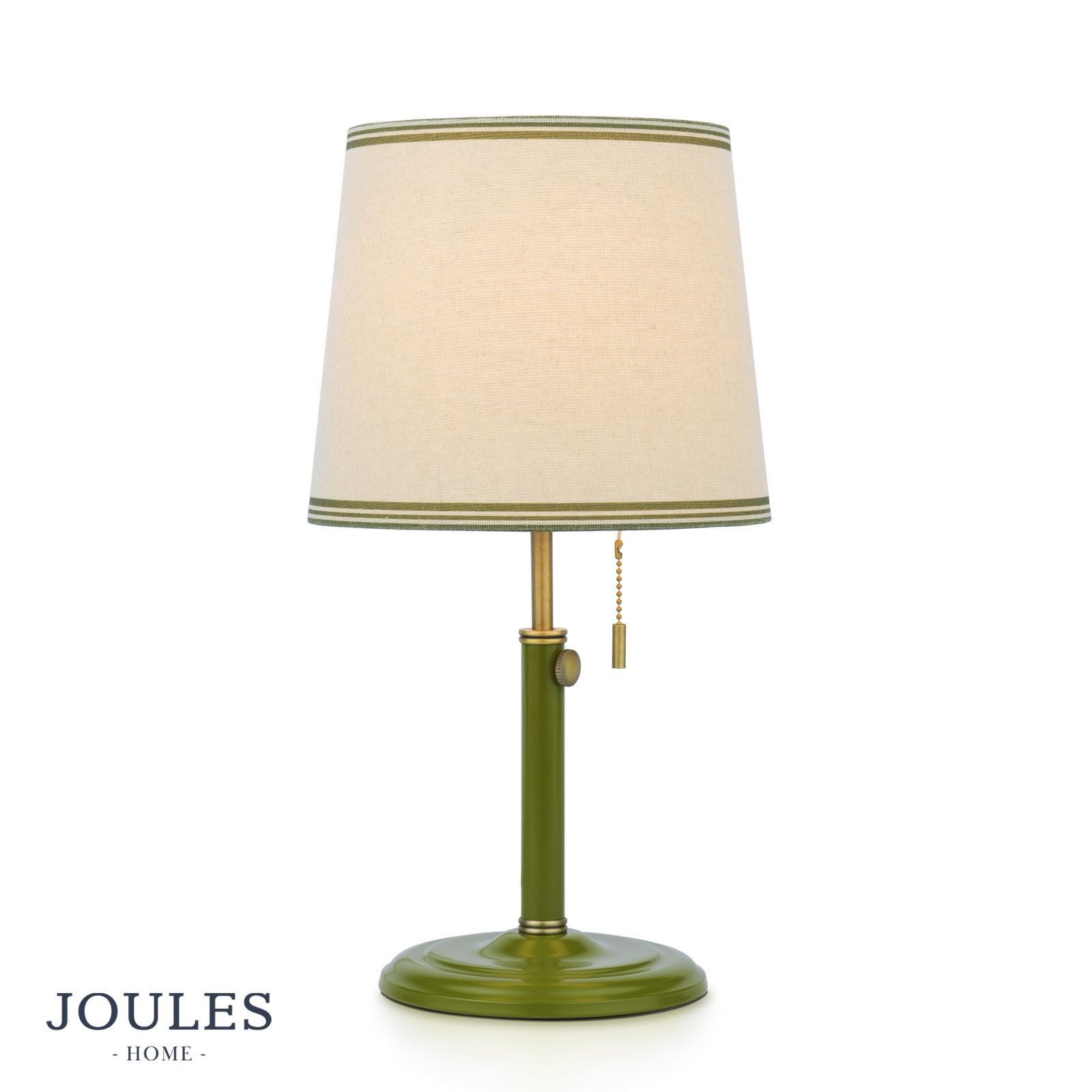 The Upton table lamp has a green matte painted antique brass base for a hint of colour and an adjustable ‘rise and fall’ stand – perfect for spaces of all sizes. It features a linen tapered lamp shade with a coloured border and a pull cord switch which offers a functional detail while also giving a nod to retro style.