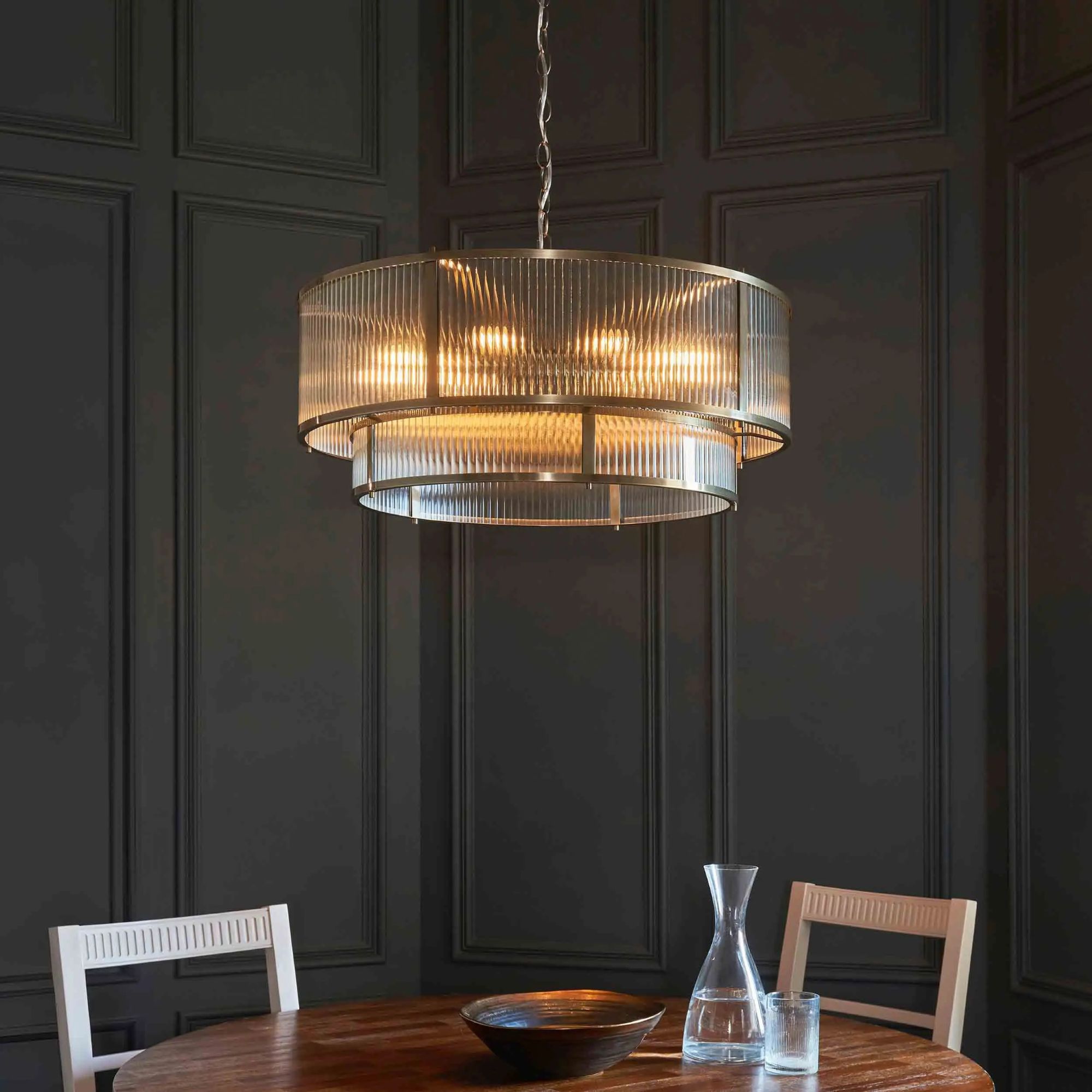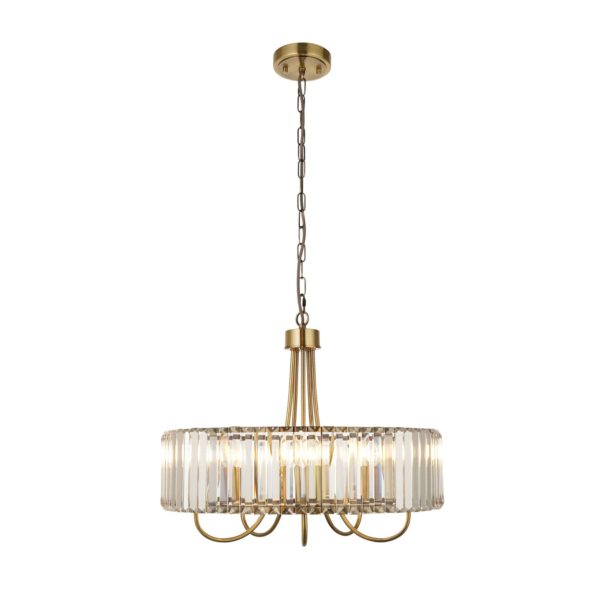 This striking 5 celing light pendant combines antique brass plated metalwork with beautifully clear cut lozenge glass to create a striking feature piece. Fully dimmable, it allows you to tailor the ambience while the faceted glass adds elegant sparkle to any room. Matching items available.