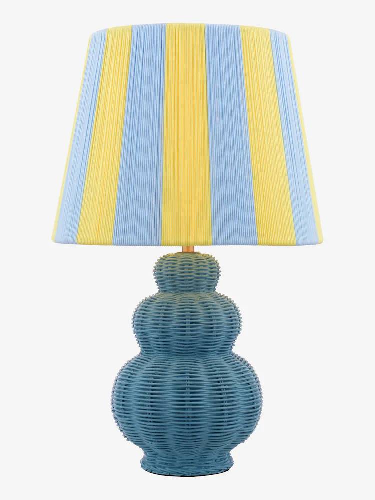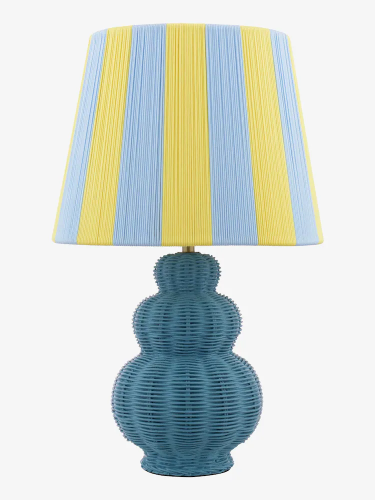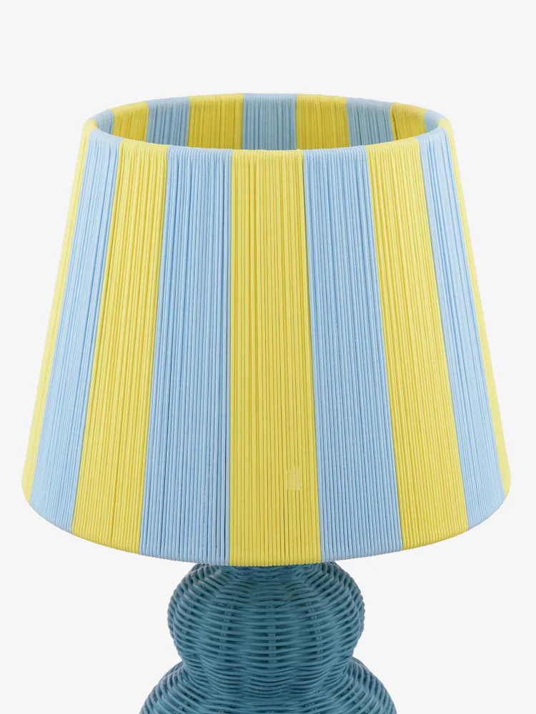 Whitby, en fargerik og interessant bordlampe, blå lampefot med rottingeffekt og nostalgisk trådskjerm i med striper i gult og blått. Den gir hint om kyst og vintage sjarm, med en moderne appeal. Whitby bringer farge og mønster til hjemmet.