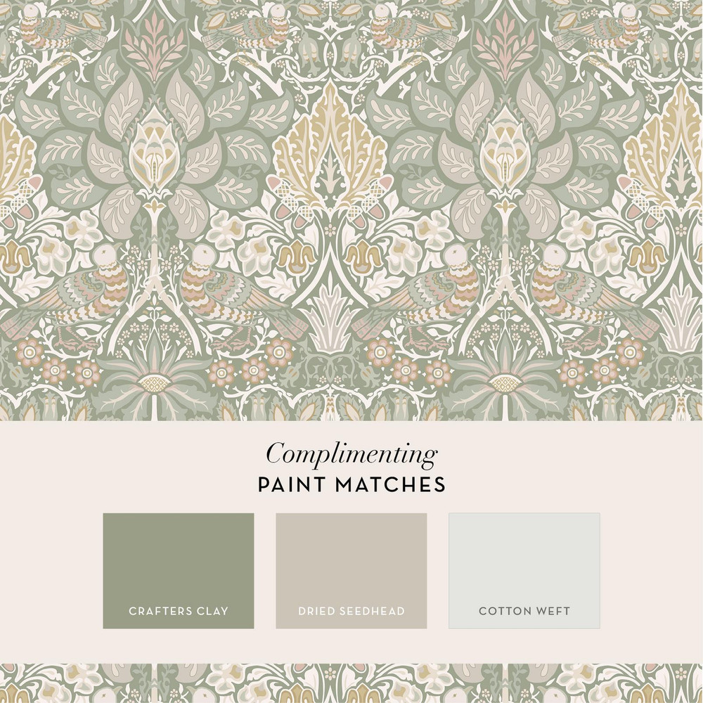 Dove & Rose Spring Garden wallpaper features nature’s elements, in greige tones, perfectly contrasted with mustard yellow and pale pink leaves. Alongside flowing vines of white and beige, extending from iconic Morris flowers, creating the perfect perching area for couples of doves in light peach, white and sage green, all laid upon a deep sage green backdrop.