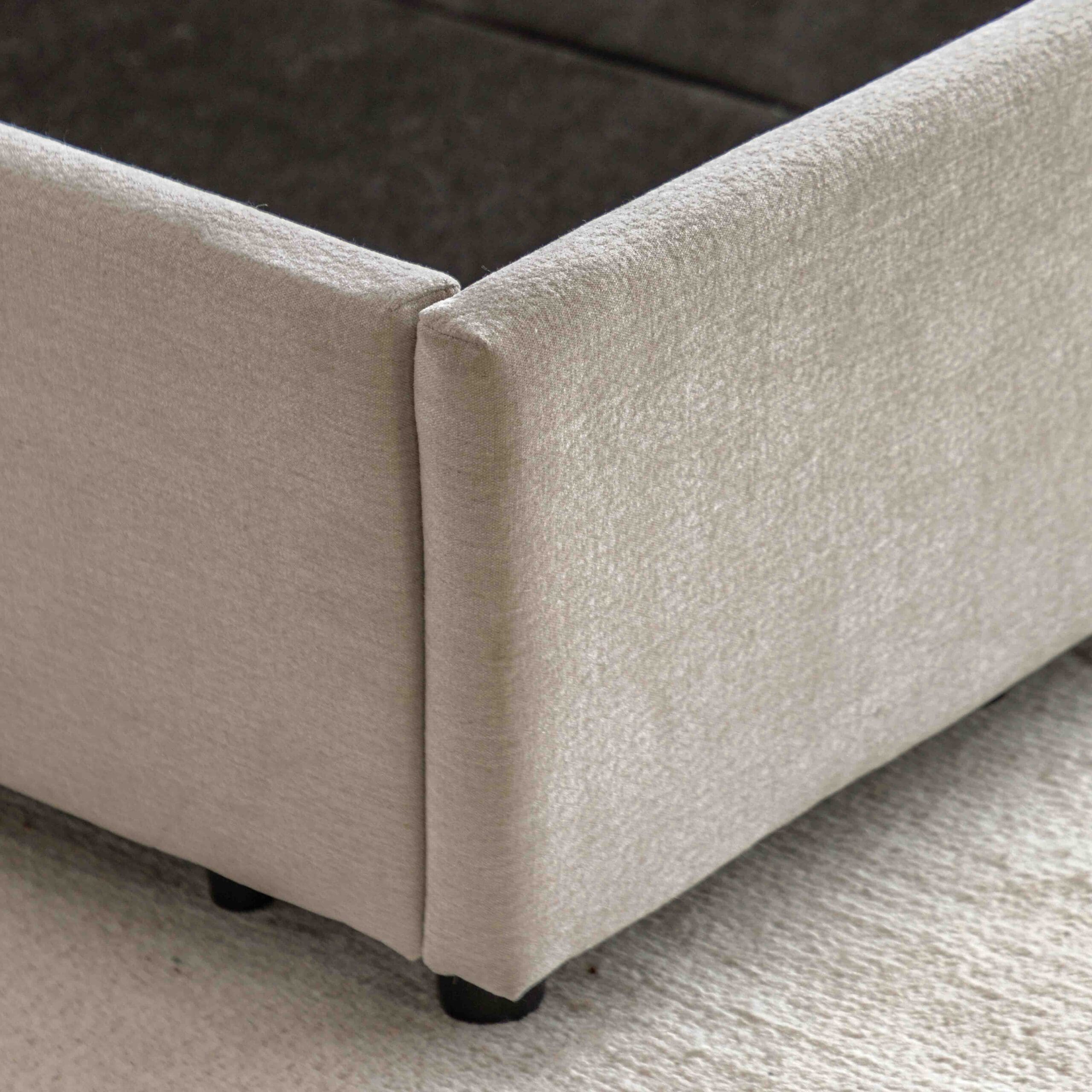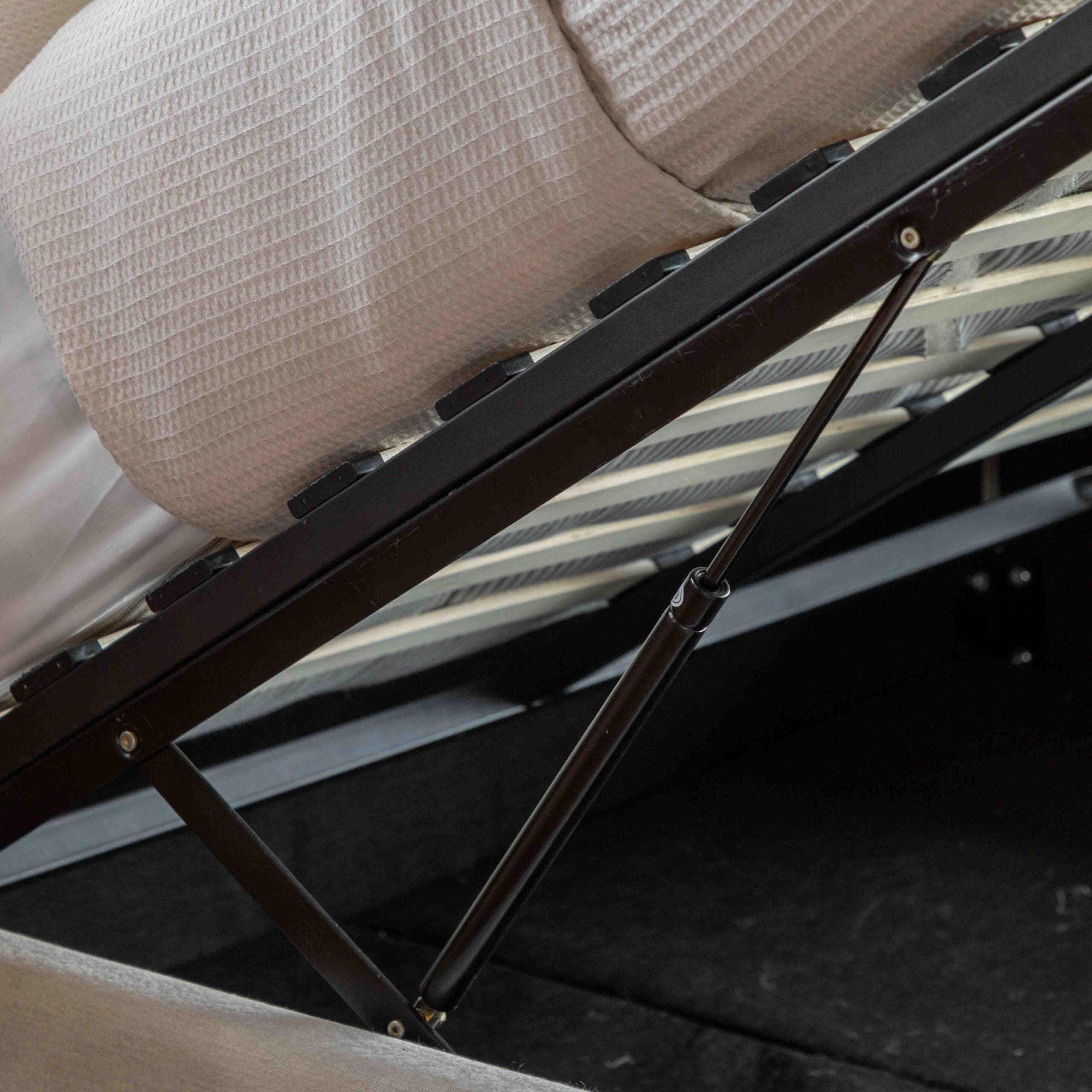 Sengen er designet for både skjønnhet og funksjon. Den har et oppbevaringsområde under sengen, noe som skaper ekstra praktisk oppbevaring.
