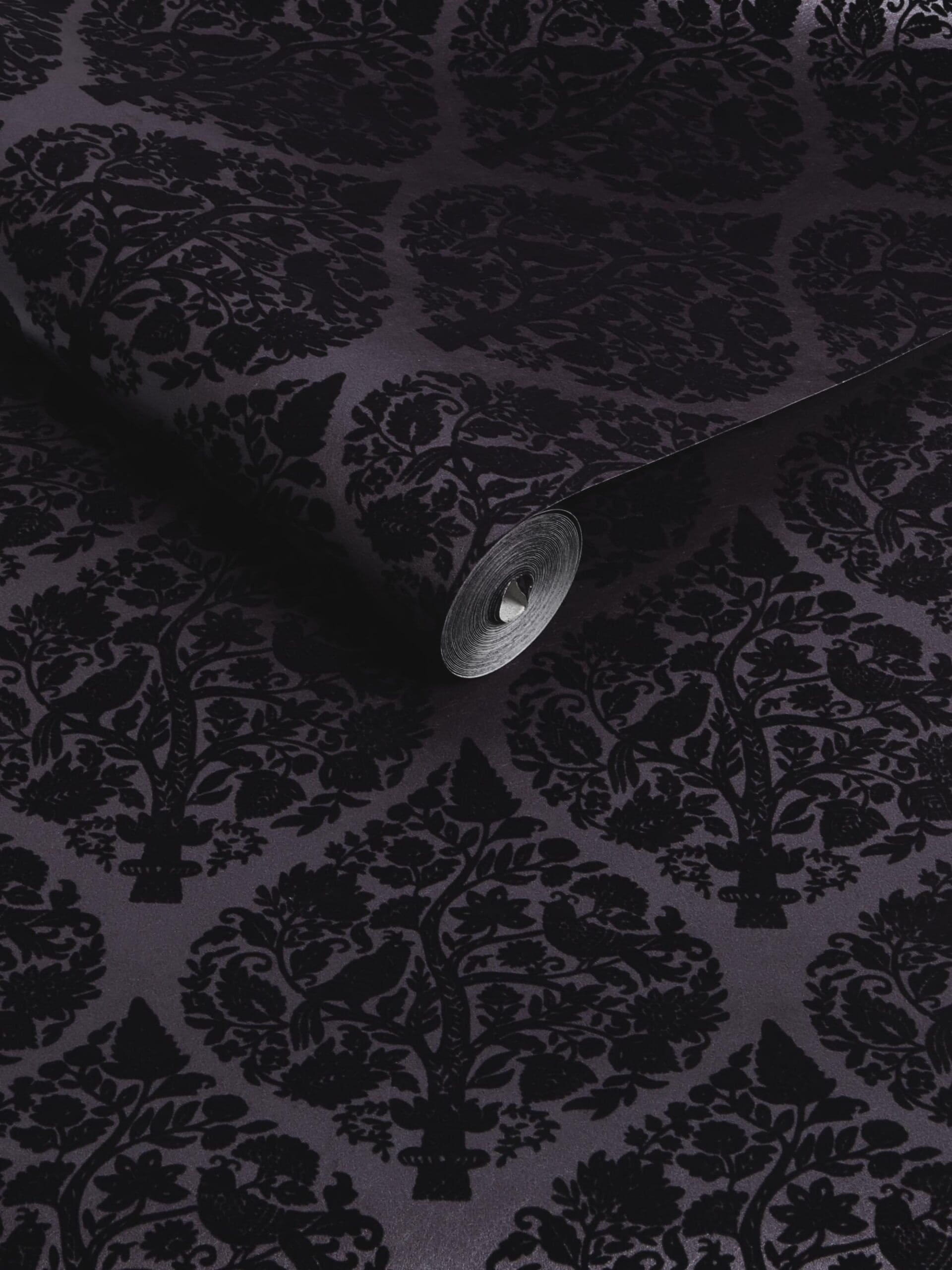 Woodland Fable, en luksuriøs dyp lilla tapet med elegant mønster i fløyel. Intrikate scener fra skogen, med fugler, blomster og grener som kommer til liv i skåret dyp lilla fløyel. Mønsteret gir en dramatisk og spennende effekt på veggen.