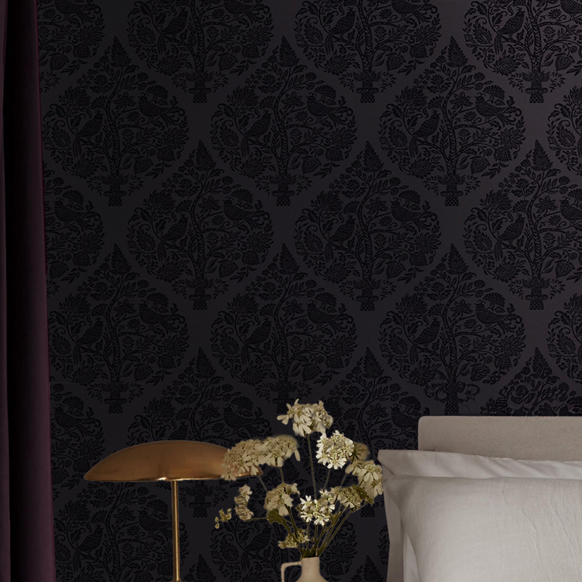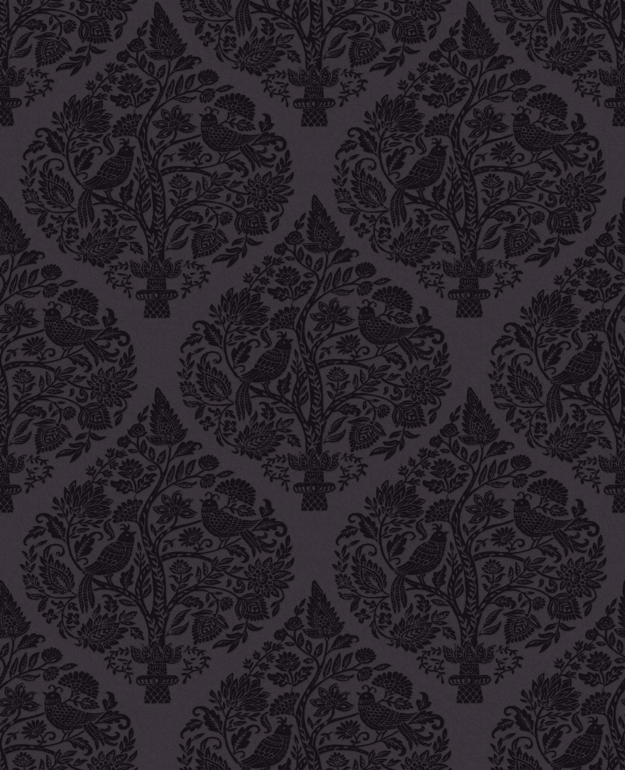 Deep purple flock forms a tapestry of flowering trees and perched peacocks, each element meticulously drawn and arranged within a graceful damask repeat. The background is a muted, warm plum sets the stage for contrast, depth and storytelling.